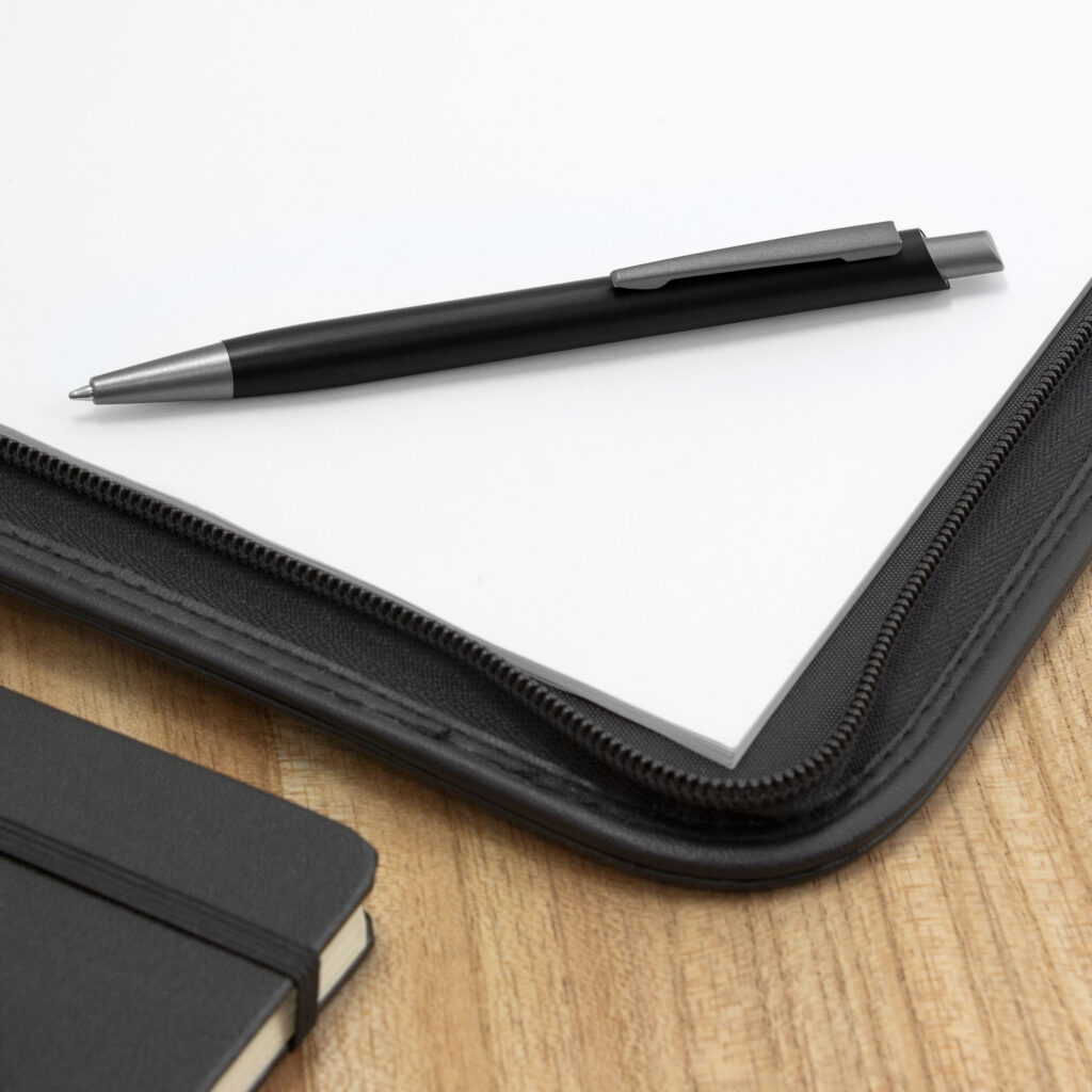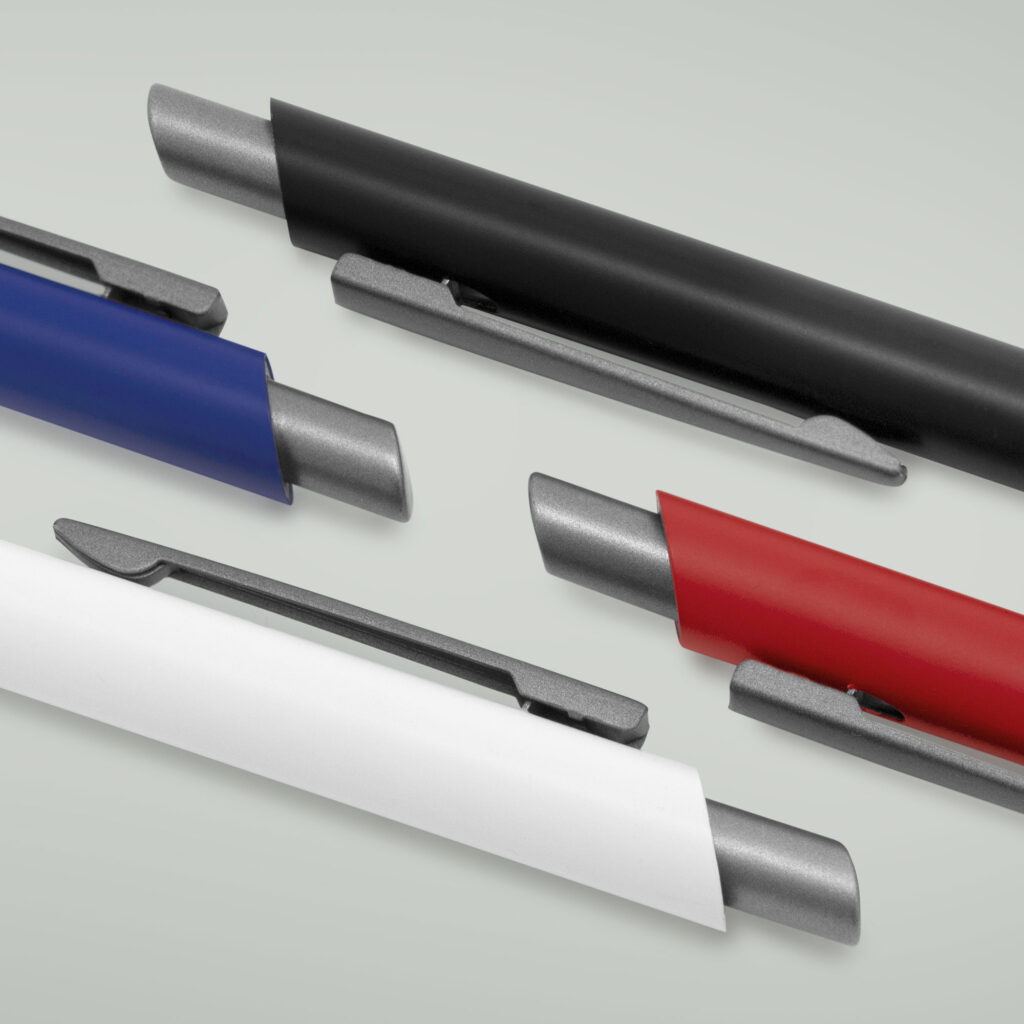 Aluminio, ABS, Acero. Bolígrafo retráctil. Cuerpo revestido con laca de diferentes colores. Acabado mate. Pulsador, clip y puntera de color gris gun metal. Tinta negra. Amplia área de impresión.