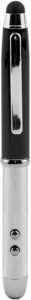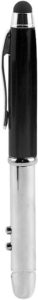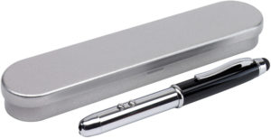 Bolígrafo, señalador laser color rojo, luz LED y punta touch para pantallas táctiles. Incluye baterías más 3 baterías de repuesto. Destape dorado al grabar.