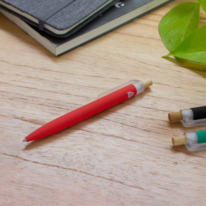 Bolígrafo retráctil. Cuerpo de aluminio en diferentes colores acabado mate. Botón pulsador de bambú. Clip plástico transparente con terminación frosty.