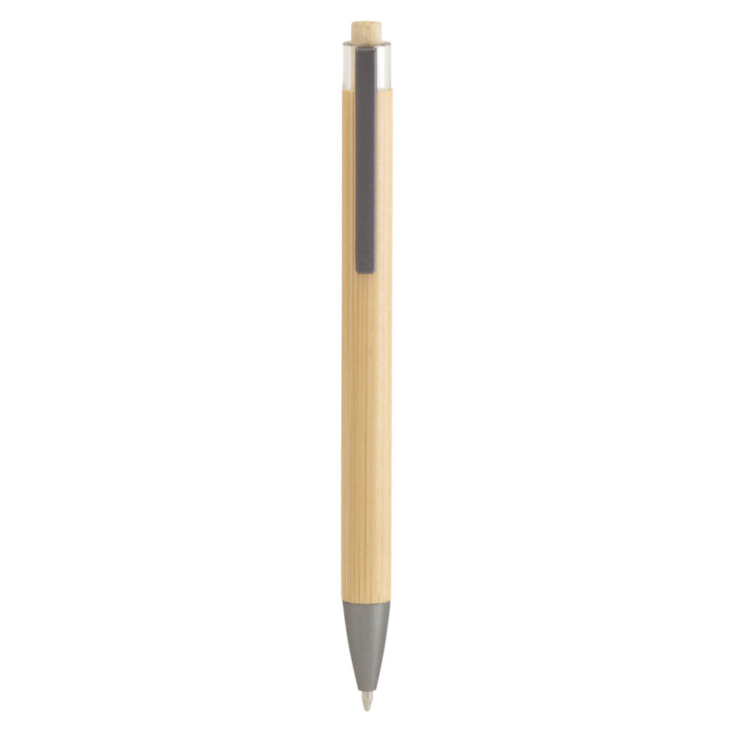 Bolígrafo retráctil. Cuerpo y botón pulsador de bambú. Clip metálico y puntera plástica en color gris gun.