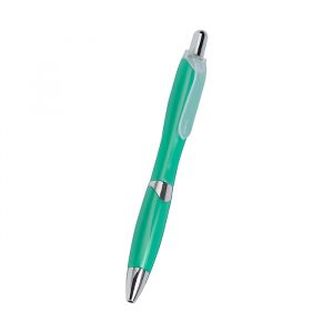 Bolígrafo de plástico con accesorios plateados, tinta negra.