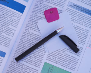 Bolígrafo de tinta de gel con recubrimiento de goma, cuerpo y tapa de color.