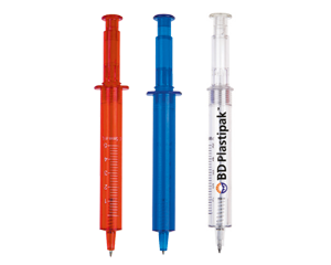 Bolígrafo en forma de jeringa con cuerpo translúcido, mecanismo de click.
