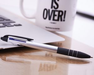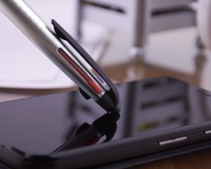 Bolígrafo de plástico en cuerpo de color con apariencia metálica. Tiene integradas 3 tintas: negra, roja y azul. Parte inferior con goma antideslizante en negro con detalles de arillos en gris. Cuenta con touch. Mecanismo deslizante.