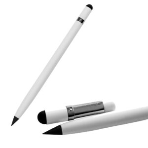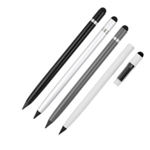 Bolígrafo libre de tinta con goma y touch screen. El trazo gris simula la línea de un lápiz, cuenta con una aleación de metales entre el estaño y bismuto, que al contacto con la hoja y la fuerza aplicada hace una reacción química de oxidación, no deja manchas y es posible borrarlo con una goma regular, la cual está incluida al destapar la parte superior del bolígrafo.