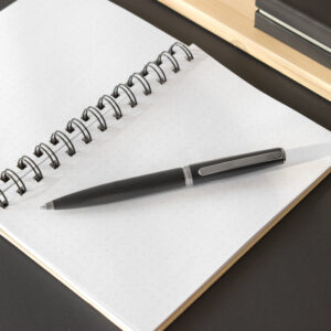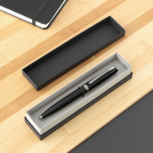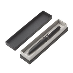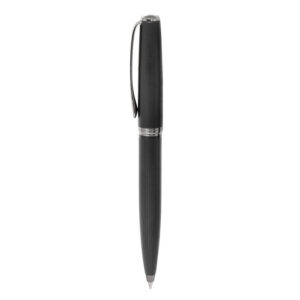Bolígrafo Metálico. Cuerpo color negro mate. Puntera, clip y anillo metálico. Apertura giratoria.