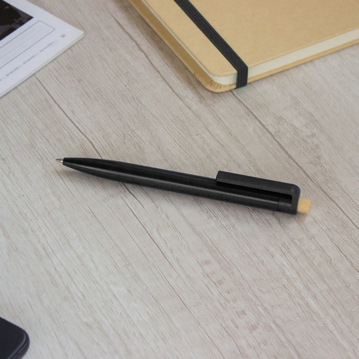 Bolígrafo retráctil. Cuerpo plástico en diferentes colores, acabado brillante. Pulsador de bambú.