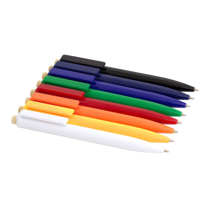 Bolígrafo retráctil. Cuerpo plástico en diferentes colores, acabado brillante. Pulsador de bambú.