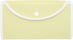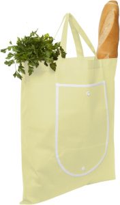 Fabricada en Non-woven. Bolsa que posee un bolsillo frontal con vivos blancos alrededor y un broche de botón.