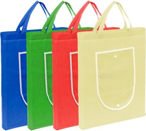Fabricada en Non-woven. Bolsa que posee un bolsillo frontal con vivos blancos alrededor y un broche de botón.