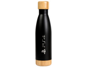 Botella plateada fabricada en acero inoxidable reciclado doble pared con tapa de rosca fabricada en bambú detalles en la base, del mismo material. Es una opción sostenible y elegante para mantener tus bebidas frías o calientes mientras contribuyes al cuidado del medio ambiente.