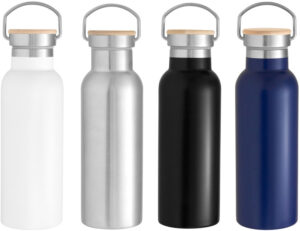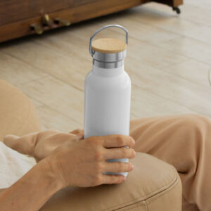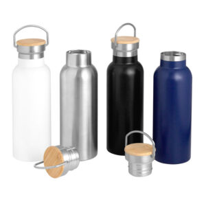 Botella térmica doble pared sellada al vacío. Interior en acero 304 y exterior en acero 201. Tapa de acero inoxidable con manija metálica rebatible y detalles en bambú. Anillo de silicona antiderrame. Mantiene por más de 12 hrs la temperatura de las bebidas calientes y 24 hrs de las bebidas frías. Presentación en caja de regalo Kraft.