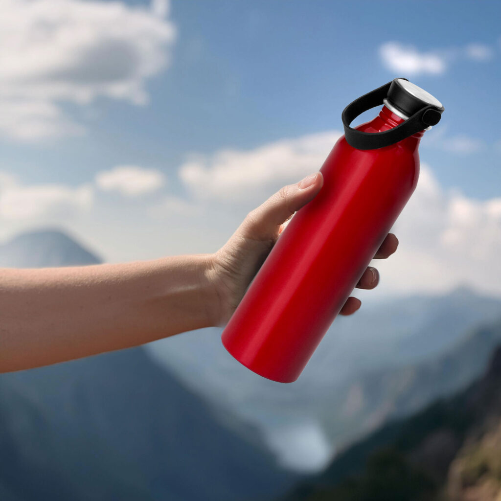 Botella de aluminio con acabado brillante. Tapa a rosca de acero inoxidable 201 y PP, con tira de silicona color negro.