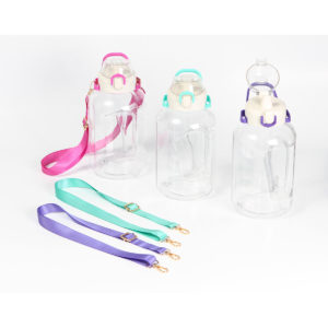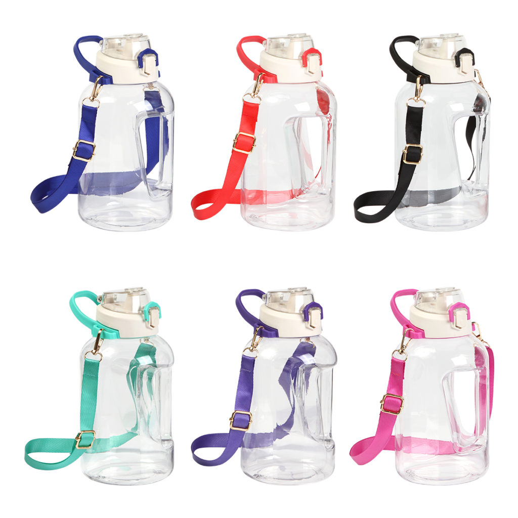 Botella jumbo de plástico transparente con capacidad de 1.4 litros (48 oz) , tapa de seguridad y correa de color con arnés. Esta botella de plástico transparente te permite llevar contigo la cantidad perfecta de líquido para mantenerte hidratado, su tapa en rosca es ideal para mantener seguro el liquido de la botella, y su correa de color con arnés desmontable se puede ajutar a tu gusto para llevarla al hombro, cruzada en el cuerpo o removerla.