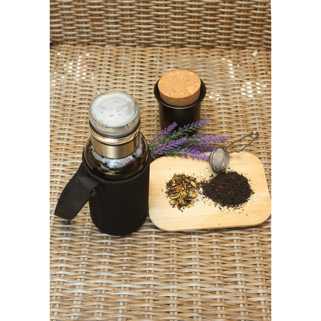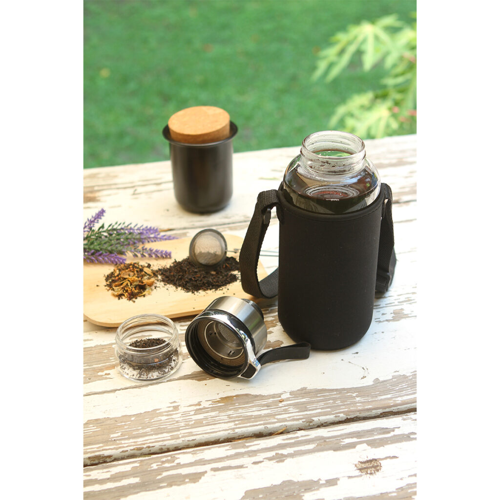 Botella especial para té, fabricada en vidrio. Capacidad de 1,400 ml. La tapa incluye sección con filtro para agregar infusiones y funda de tela con correa ajustable. El té puede colocarse en la tapa o en el cuerpo de la botella. Ideal para disfruta de un té delicioso y lleno de sabor en cualquier lugar.