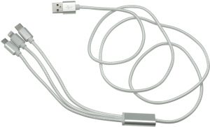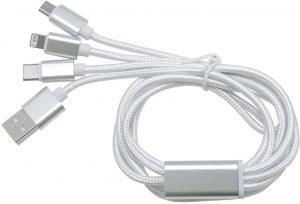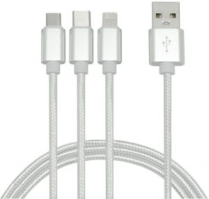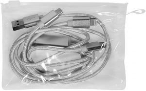 Cable con entrada USB y diferentes adaptadores: Iphone, tipo C y Android. Viene dentro de una bolsa plásticas con cierre ziploc.