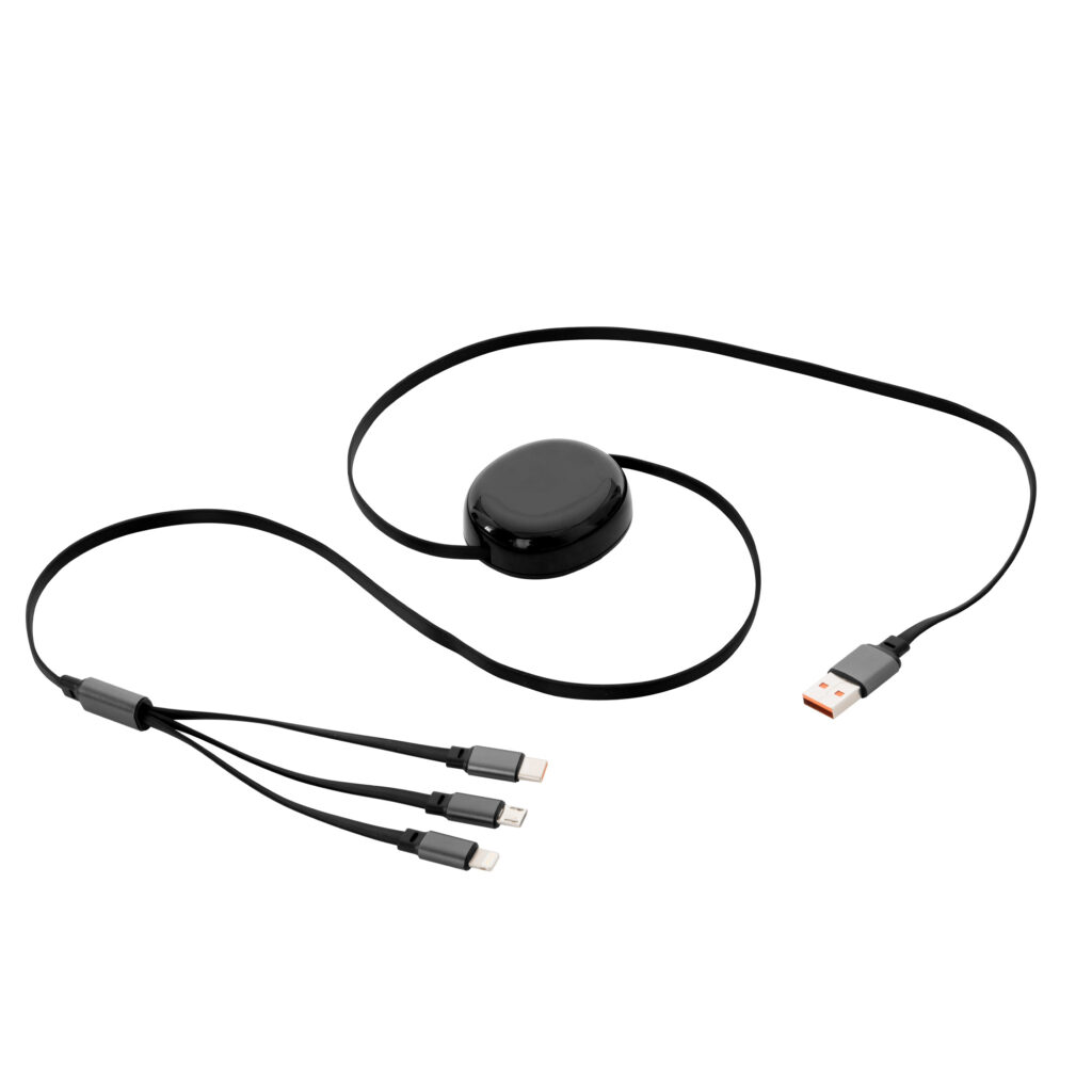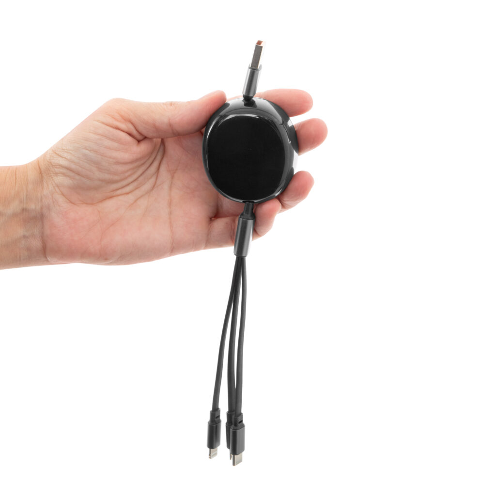 Cable de carga retráctil con longitud de hasta 115 cm. 3 en 1. Posee tres conectores (Lightning, USB-C y USB standard).