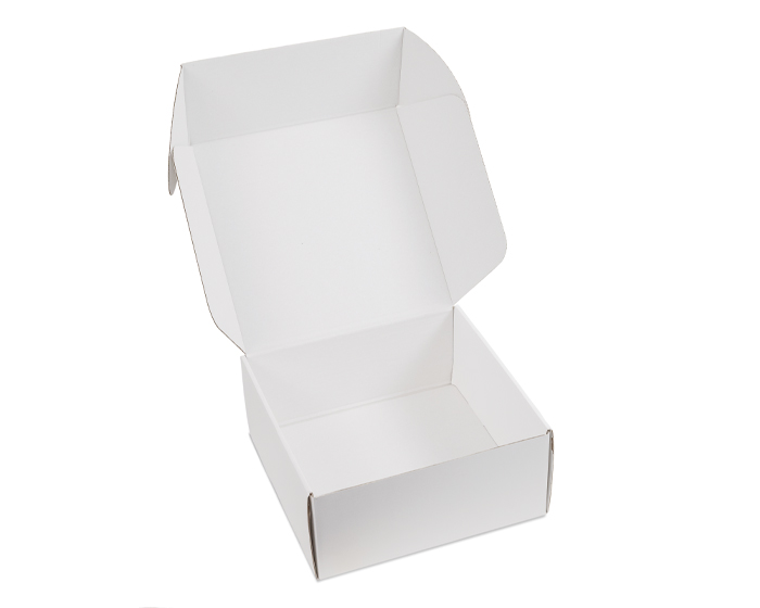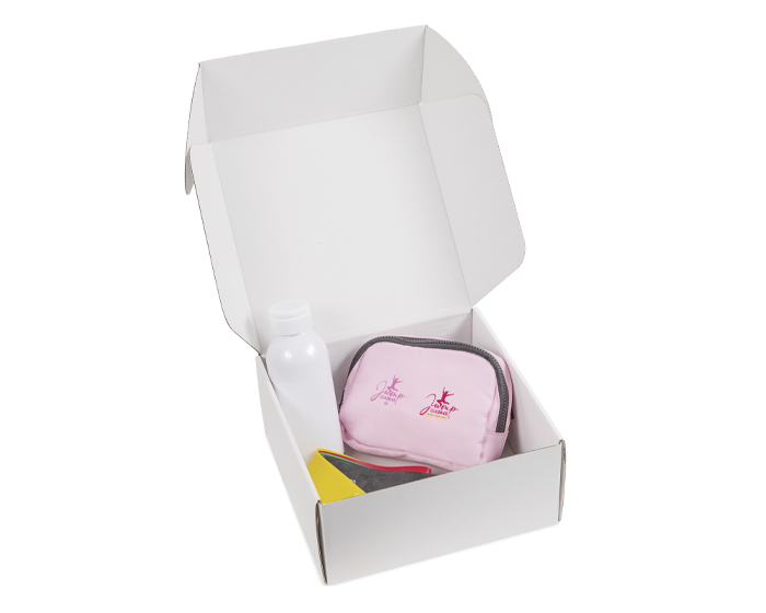 Caja de cartón blanco mate, ideal para regalos y kits promocionales. Se entrega desarmada. Venta en múltiplos de 10.