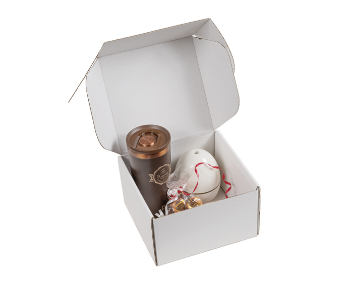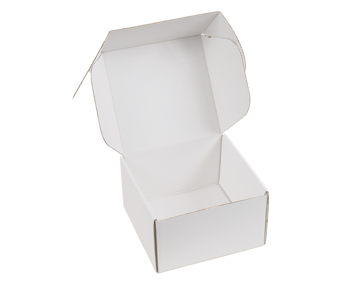 Caja de cartón blanco mate, ideal para regalos y kits promocionales. Se entrega desarmada. Venta en múltiplos de 10.