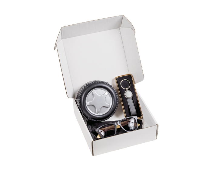 Caja de cartón blanco mate, ideal para regalos y kits promocionales. Se entrega desarmada. Venta en múltiplos de 10.