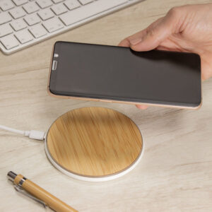 Cargador inalámbrico. Base plástica color blanco con antideslizantes. Entrada: 5V/2A, 9V/1.1A. Salida: 10 watts. Distancia de transmisión: <=8 mm. Eficiencia de Carga: >=73%. Control de temperatura. Detección de objetos extraños. Luces indicadoras de carga. Cable de carga USB-C en color blanco de 50 cm de largo. Presentación en caja de regalo kraft.
