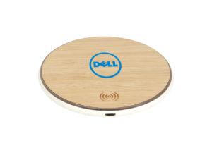 Cargador inalámbrico de 10 W con tecnología Qi, fabricado en bambú y plástico ABS. Incluye cable USB y caja de cartón individual.