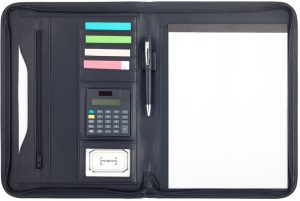 Contiene block de hojas lisas tamaño A4. Porta bolígrafo. Bolsillo externo. Compartimentos internos para tarjetas, sobre con fuella y bolsillo interno con cierre. Incluye calculadora.