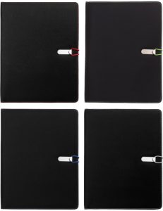 Carpeta de microfibra con block de hojas blanca. Cierre con banda elástica. 3 presillas para bolígrafos. Folder interno. Compartimentos internos para tarjetas.
