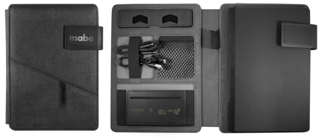 Carpeta ejecutiva de 64 hojas rayadas con power bank de 4,000 mAh, diferentes compartimientos, soporte para celular y cables de carga.