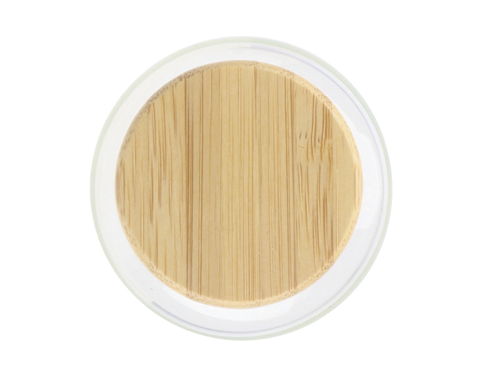 Cilindro de vidrio de borosilicato con tapa de rosca de bambú. CAP. 600 ml. Presentación: caja en color negro.