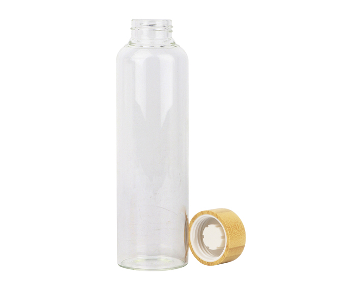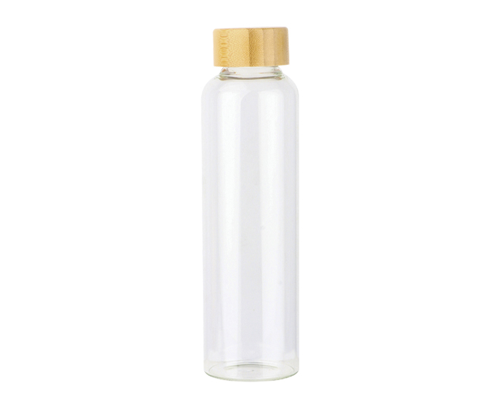Cilindro de vidrio de borosilicato con tapa de rosca de bambú. CAP. 600 ml. Presentación: caja en color negro.
