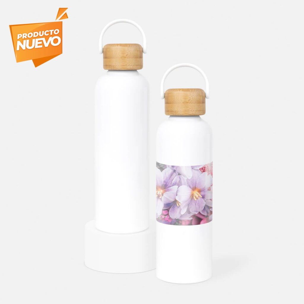 Cilindro metálico para sublimar de una pared. Tapa de bambú con cierre de rosca y asa de plástico. Incluye caja individual. El bambú es un producto natural el cual puede presentar variaciones en tonalidades y vetas.