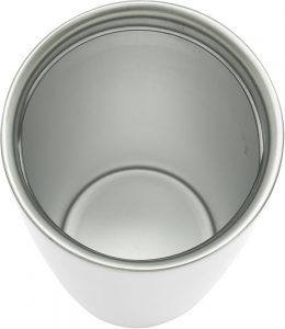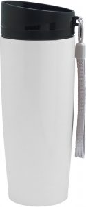 Acero inoxidable tipo 201 exterior y 304 interior. doble pared tapa a rosca, botón para abrir y cerrar. Lazo para sujetar en la muñeca. Base antideslizante.