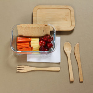 Contenedor para alimentos fabricado en vidrio, con banda elástica, tapa y cubiertos de bamboo.