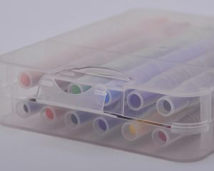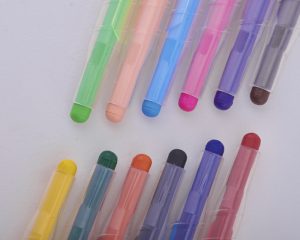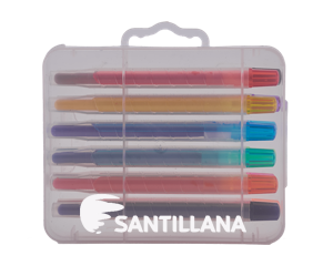 Estuche rígido transparente de 12 crayolas tipo plumón en diferentes colores. Al girar la tapa superior, la punta de la crayola se desliza y queda lista para iluminar, dibujar o escribir. El estuche abre 180 grados, tiene forma de un pequeño portafolio y cierra en forma segura.