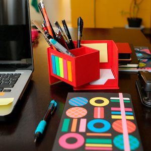 Cubo ecológico con hojas para notas, 100 banderas de colores adheribles y porta plumas.