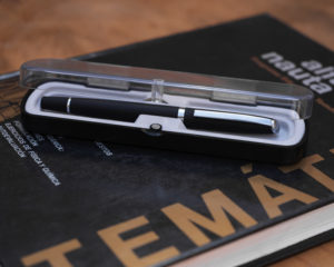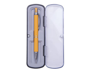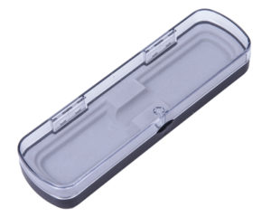 Estuche para bolígrafo con tapa transparente y cierre magnético. Interior en terciopelo gris.