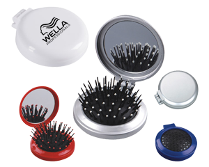 Estuche plegable de plástico, con cepillo y espejo, las puntas del cepillo se retraen al cerrarlo.