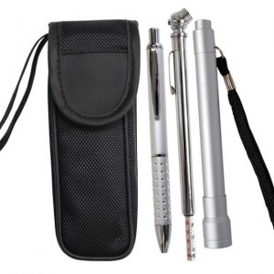 Medidas: Linterna 14 x 1.8 cm Boligrafo 13.5 x 1 cm Calibrador 14 x 1 cm Estuche 16 x 6 x 2 cm.