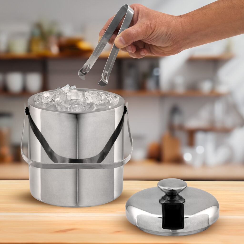 Ø 14 x 14 cm. Capacidad 1100 ml. Acero inoxidable. Interior en acero 304 y exterior en acero 201. Hielera de mesa con tapa. Pinza para hielo de acero inoxidable, encastrable en la misma tapa. Asa de acero inoxidable para transportar. Presentación en caja de regalo kraft.