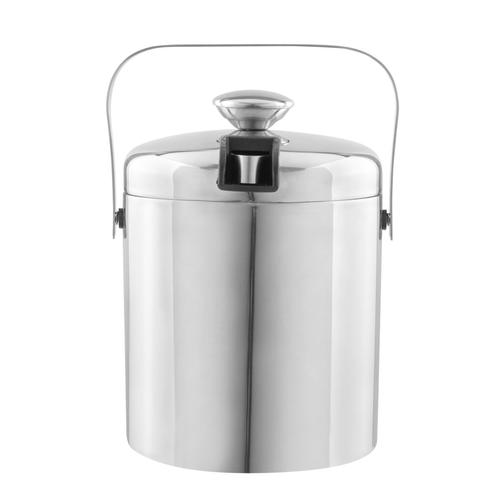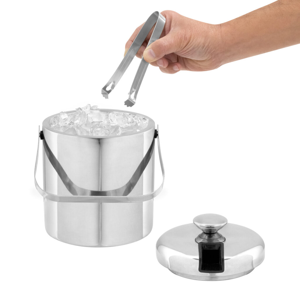 Ø 14 x 14 cm. Capacidad 1100 ml. Acero inoxidable. Interior en acero 304 y exterior en acero 201. Hielera de mesa con tapa. Pinza para hielo de acero inoxidable, encastrable en la misma tapa. Asa de acero inoxidable para transportar. Presentación en caja de regalo kraft.