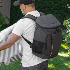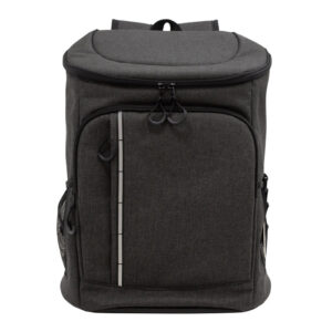 Mochila cooler. Compartimento principal con cierre en la parte superior. Compartimento frontal con cierre, bolsillo interno de red con cierre y bolsillo externo vertical con cierre y banda reflectante. Dos bolsillos laterales de red multipropósito. Incluye destapador de botellas de acero inoxidable (6,3 x 3,3 cm) extraíble. Correas regulables acolchadas. Cierres metálicos. Tiradores de cierre plásticos en forma de U de color negro.