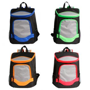 Tipo back pack bi-tono. Fabricada en poliéster. Disponible en colores azul, naranja, rojo y verde.