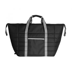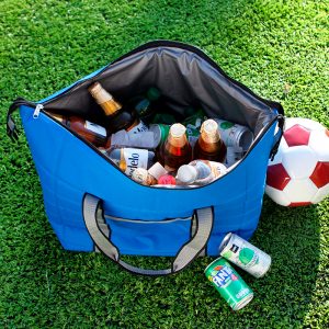 Hielera fabricada en poliéster con bolsa exterior y asas, capacidad de 37 litros.