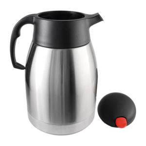 Jarra térmica fabricada en acero inoxidable con tapa dosificadora antiderrame, capacidad de 1,200 ml.
