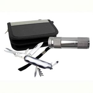 Set de 3 piezas, incluye: estuche con llavero arnés, navaja Multi-funcional y linterna.