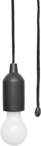 Lámpara con luz led. Contiene un lazo que al tirarlo enciende y apaga la luz de la bombilla. Utiliza 3 baterías AAA incluidas.