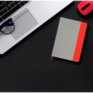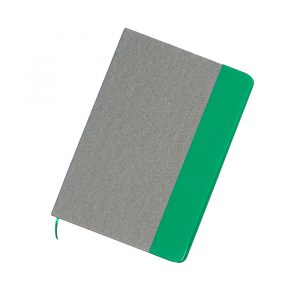 Libreta bi-tono fabricada en PU con listón separador de hojas y 80 hojas de raya tamaño a5.