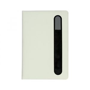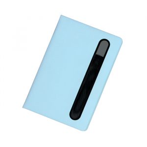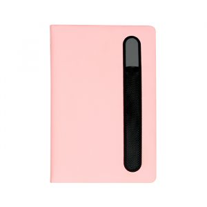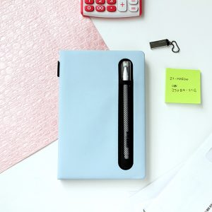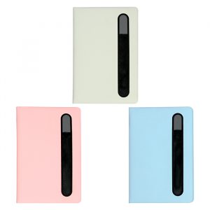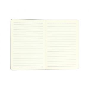 Libreta fabricada en curpiel con porta pluma en portada y 80 hojas de raya tamaño a5.