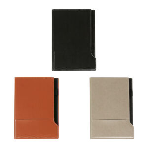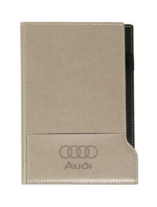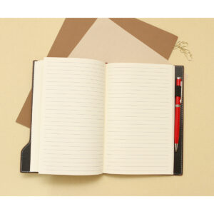 Libreta con cubierta fabricada en PU combinada con cartulina, elástico para bolígrafo y bolsillo. Interior: papel crema de 80 g, 80 hojas rayadas. Páginas finales: marcador de cinta de papel en blanco color crema de 150 g.